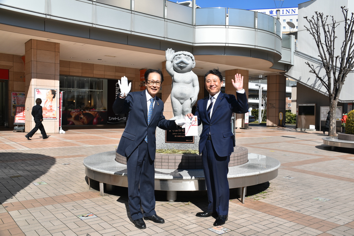 香川市長は、「志木駅東口を行き交う皆さんを見守り、未来へと進む志木市の発展を見守る、ロータリアンの熱い想いが込められた「まちあわせ河童」の目に、しっかりと志木市の活気を刻んでいきます」と贈呈への感謝を述べられました。